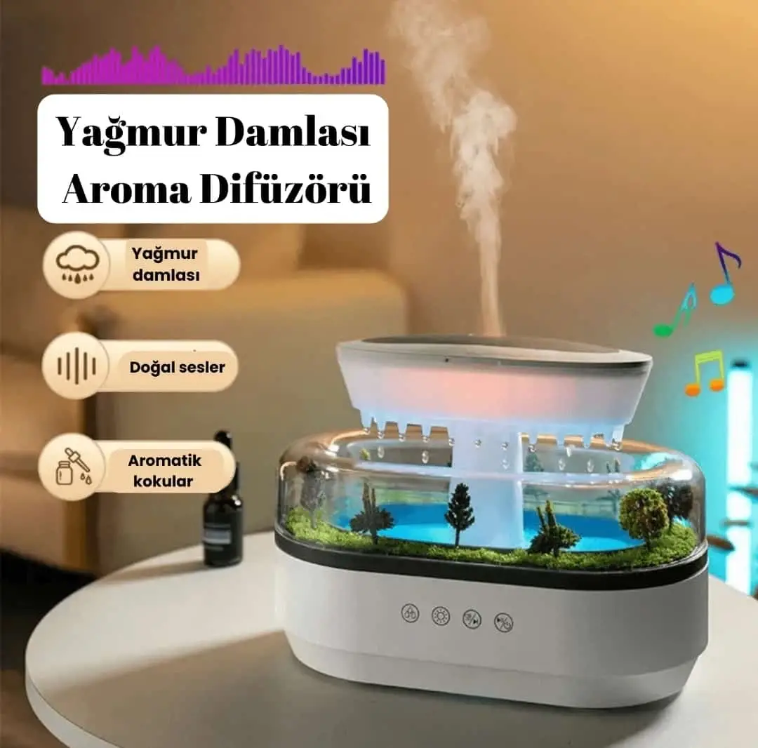 Stres ve Yorgunluk Giderici: Gerçekçi yağmur damlası sesleri ve aromaterapi özelliğiyle zihninizi rahatlatır, fiziksel yorgunluğunuzu azaltır.