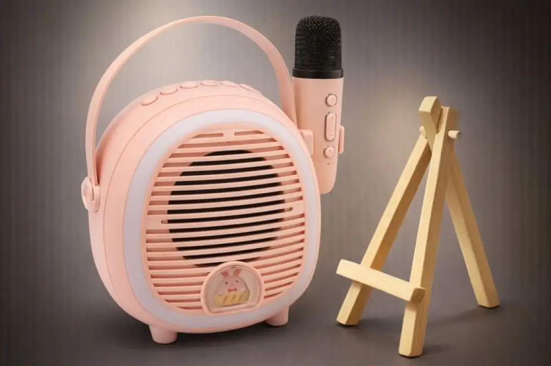 Retro görünümlü karaoke hoparlörü; eğlence, müzik ve yaratıcılığı bir araya getirir. Kompakt ve hafif yapısı sayesinde çocukların da rahatça taşıyabileceği şekilde tasarlanmıştır. Renkli LED ışıklandırması, çoklu ses efektleri ve tripod uyumu ile evde sahne deneyimi sunar.